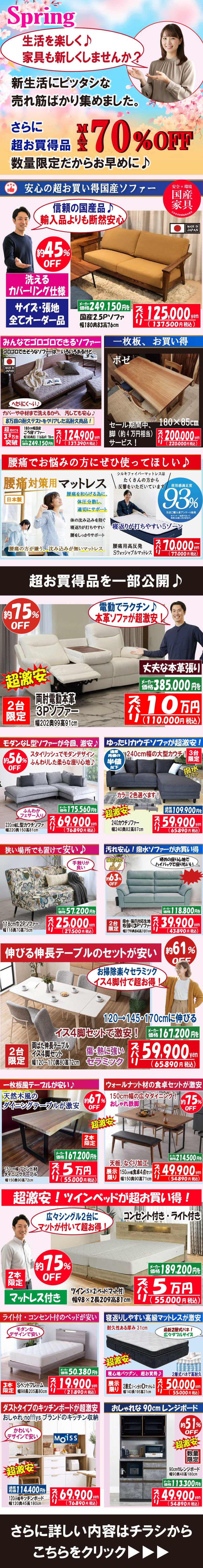 2026バレンタインセール 2026年1月23日 チラシを確認する LINEで問い合わせ よくある質問-FAQ- なぜ安いのですか? メーカーさんからの直接仕入れで中間マージンをカット。ローコスト経営で、販売価格をお安くさせていただいています。 新品家具で納品されますか? 展示品以外はすべてメーカーより新品を取り寄せて、お届けします。 保証はありますか? 1年間のメーカー保証になります。 商品のお届けの期間は? 在庫がある場合は1~2週間前後のお届けとなります。詳しい納期についてはスタッフまでご相談ください。 支払いにカードはつかえますか? 【現金】【各種クレジットカード】【paypay】【はばたんpay】、【イオンpay】がご利用できます。着払いの場合は現金のみのお取り扱いになります。特典をご利用する場合は、現金払い(着払いOK)がお得です。 駐車場はありますか? 店舗北側に10台分の駐車場がございます。又、店舗の前面道路の東側の空地も駐車していただけます。両方とも満車の場合は、店舗南東側の踏切北の本田パーキングをご利用ください。駐車券をお持ちください。