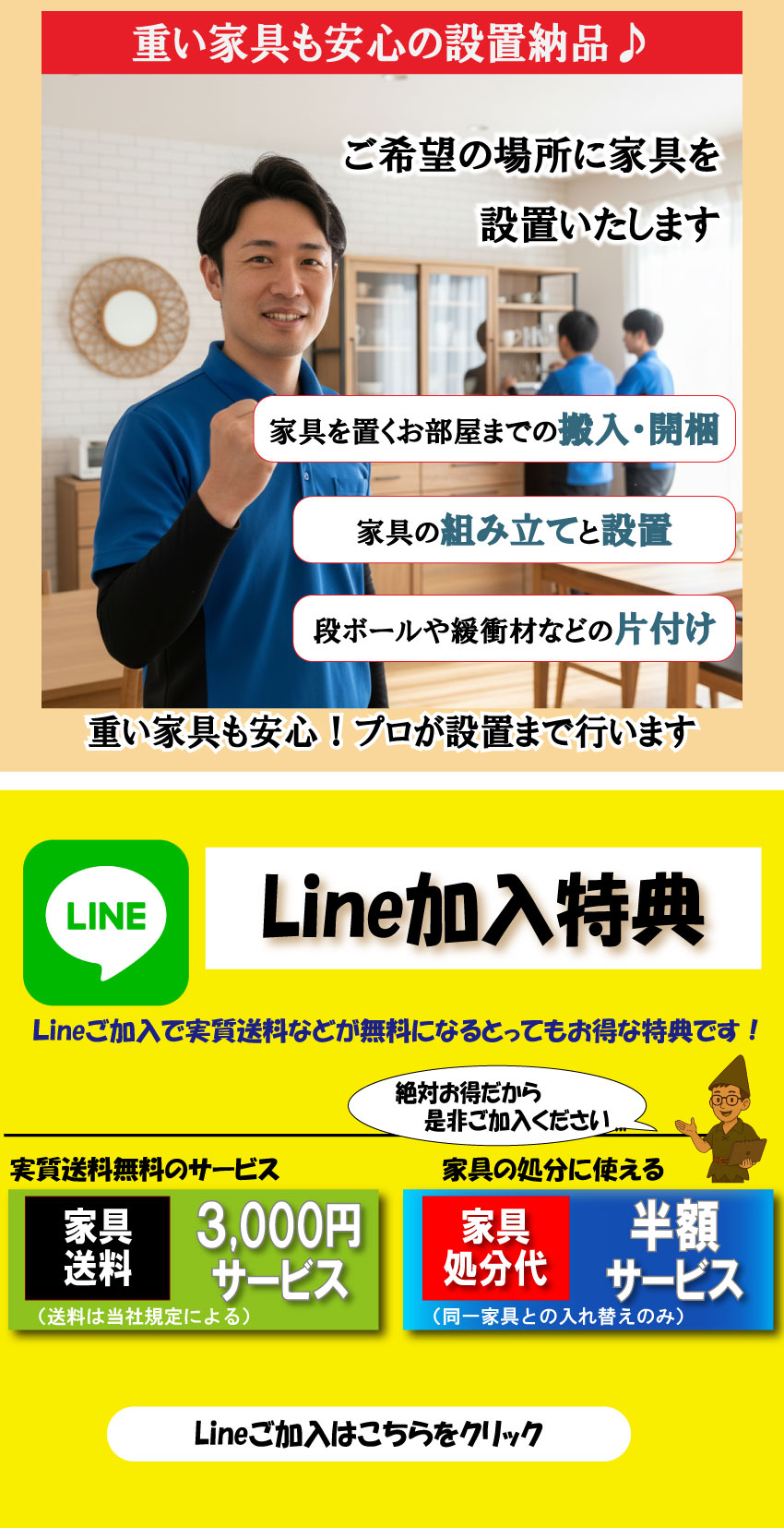 2026年グーグル広告用 2026年2月24日 チラシを確認する LINEで問い合わせ よくある質問-FAQ- なぜ安いのですか? メーカーさんからの直接仕入れで中間マージンをカット。ローコスト経営で、販売価格をお安くさせていただいています。 新品家具で納品されますか? 展示品以外はすべてメーカーより新品を取り寄せて、お届けします。 保証はありますか? 1年間のメーカー保証になります。 商品のお届けの期間は? 在庫がある場合は1~2週間前後のお届けとなります。詳しい納期についてはスタッフまでご相談ください。 支払いにカードはつかえますか? 【現金】【各種クレジットカード】【paypay】【はばたんpay】、【イオンpay】がご利用できます。着払いの場合は現金のみのお取り扱いになります。特典をご利用する場合は、現金払い(着払いOK)がお得です。 駐車場はありますか? 店舗北側に10台分の駐車場がございます。又、店舗の前面道路の東側の空地も駐車していただけます。両方とも満車の場合は、店舗南東側の踏切北の本田パーキングをご利用ください。駐車券をお持ちください。